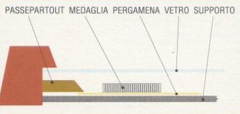 U svakom slučaju ostaje problem lebdenja pergamene u praznom prostoru koji nastaje između stakla i poleđine zbog debljine medalje. Jedini način da se pergamena održi ravno je zalijepiti ju za poleđjinu, ali ovo rješenje nije uvijek preporučljivo i u svakom slučaju potrebno je odobrenje kupca.